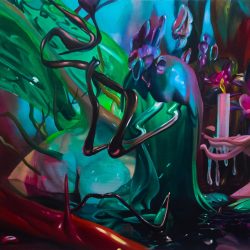 Powerful, saturated colors, reflective surfaces, baroque formalization, and impenetrable density are the most characteristic features of these paintings, which employ brilliant painterly solutions. The figures are often recognizable as torsos, while at other times the form acquires a recognizable body in liquid or even droplet-like melting material. Birth and decay, formation and disappearance, transience and duality are the most characteristic features of these indefinable media, which often evoke underwater worlds with their weightless floating. In the dialogue between sculptural and painterly qualities, creatures formed by nature and human or man-made figures seem to be moving towards a new, as yet non-existent common quality, where the characteristics of human, natural and mechanical forms of existence merge.