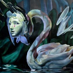 Just as the concept of fusion plays an important role in the themes of their paintings, the visual worlds of the two artists, Oksana Simatova (1979) and Pyotr Golosapov (1982), are inseparably fused in their creative process. The sculptures created in Pyotr’s virtual studio, but without physical form, are filtered through Oksana’s imagination and become visible on the surface of her canvases. In most of the paintings, we see bodies in the process of formation, in an environment where the artificial, the human, and the natural are simultaneously present.