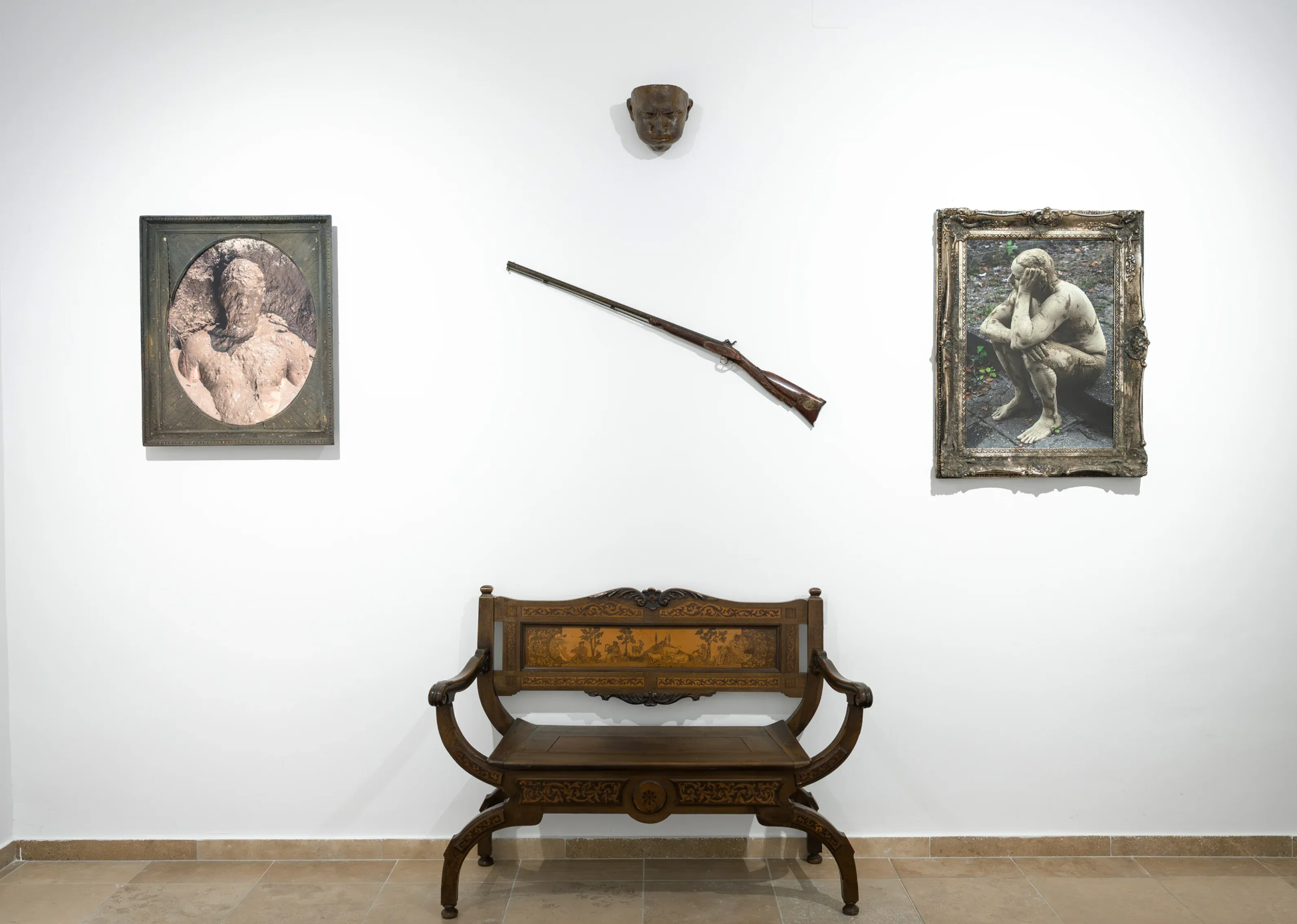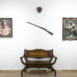 A kiállításon bemutatott művek egy része olyan fotókból áll, amelyek ezt az átváltozás során létrejött lényt örökítik meg. A művek másik részét a mázazott, égetett kerámiafejek alkotják, amelyek a Sárember groteszk, torz, ám egyszerre vicces és esetlen manifesztációi. A sajátos installáció pedig lakberendezési tárgyakkal – az emberi civilizáció letisztult, régi formáival – együtt bemutatva láttatja a művek egyik alapmotívumát: az ellentéteken alapuló harmóniát.