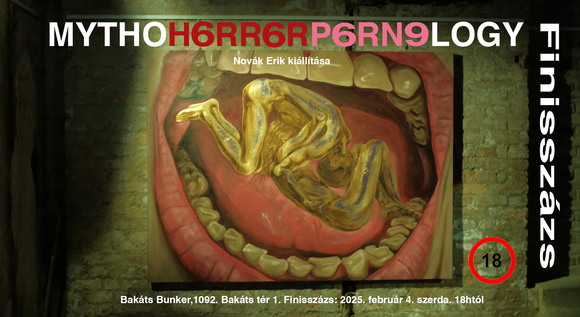 Novák témája a mitológia, az ember kultúrtörténeti őseredete, amely mentén elkülönítette magát más létezőktől és önmagára talált, leltárba vette saját gesztuskészletét és életigenlését. A MYTHOH6RR6RP6RN9LOGY képsíkjain viszont a személyesség obszcén preparátumává válnak a kisajátított, világukat vesztett szent formák. Vagy a ma lehetséges egyedüli szakrális gyakorlattá. Vagy én tényleg csak őszinte akartam lenni. Vagy érezni egy nagyot. Vagy semmit. Vagy. Vagy. Vagy. Egy biztos: Isten gyermekei kiváló holttestek.