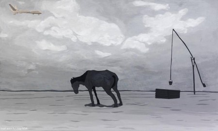 #1 Hecker Péter: Izraeli drón a Hortobágy felett, 2013, akril, vászon, 140×200 cm, magángyűjtemény