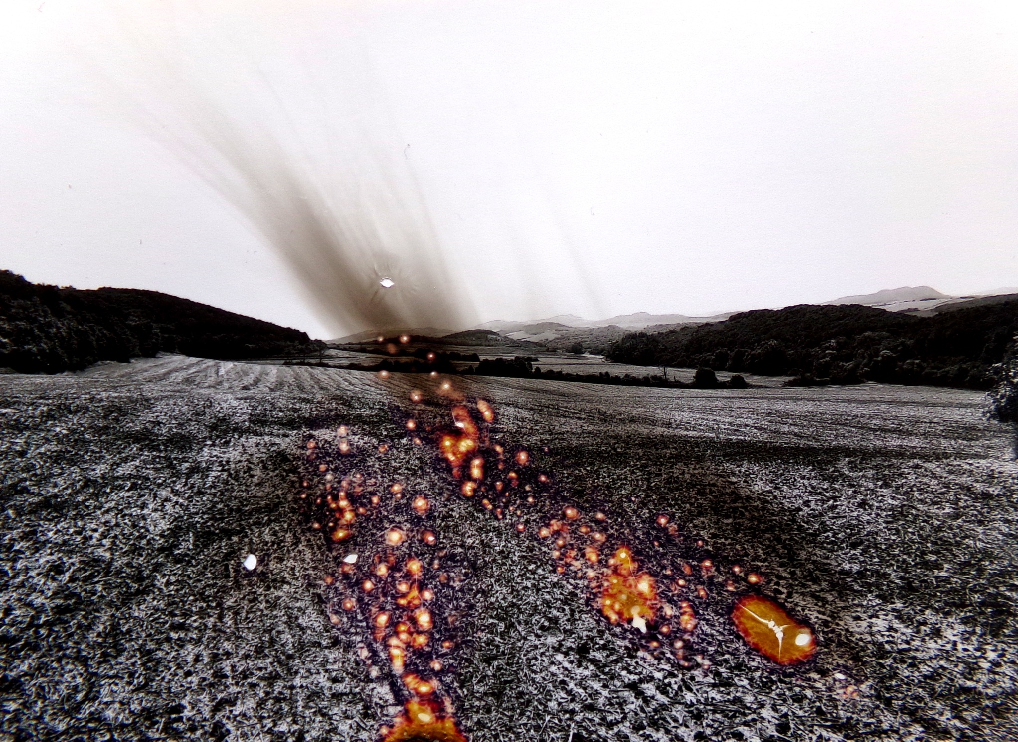 Závorszky-Simon Márton 2020-2023 között készített sorozatában leginkább fekete-fehér fotókat, elidegenedett, magányos, hideg tájakat látunk, melyekben az egyetlen színt a fényképekbe égetett tűz képviseli. Az égetéses jelhagyás manuálisan, valóban lánggal történik, a fotópapír kémiai reakciója adja az elszíneződést, miként azok valóban a tájakban, földeken, kopár fák csúcsán, rózsabokron fellobbanó tüzeknek hatnak. A destrukció-rekonstrukció határán mozgó képi világ így minden drámaisága ellenére a történés, a változás reményét is hordozza.